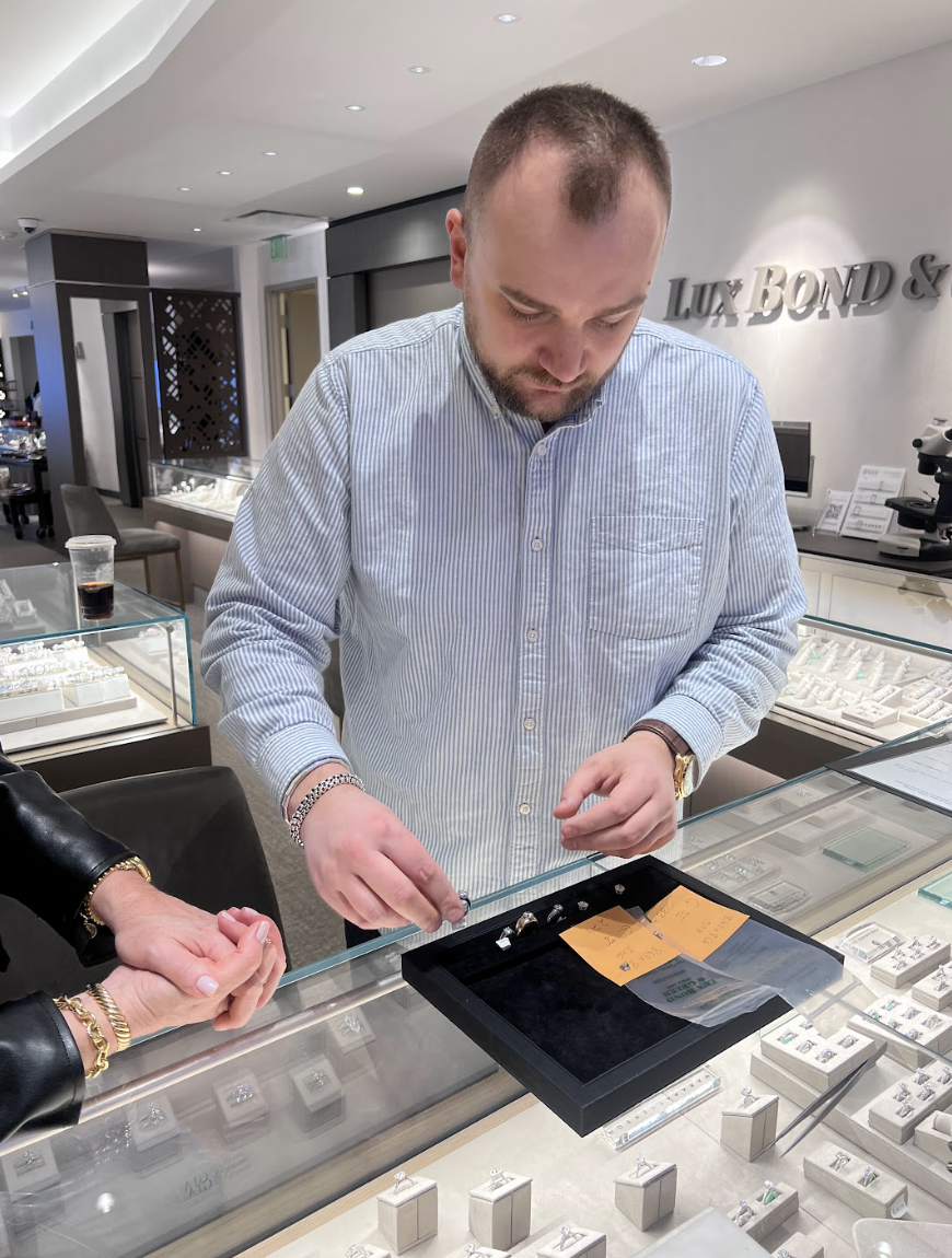 From there, an idea was born—with the help of Griffin’s mother. “We knew that his grandmother was often at Lux Bond & Green; she had purchased everything from diamonds and gold to Rolexes and figurines at that wonderful jewelry store,” says Hurst. “His mother told me that some of the grandmother’s jewelry had been left to her family, and we decided that we could use the natural diamond from a pair of her earrings to be the center of an engagement ring.”