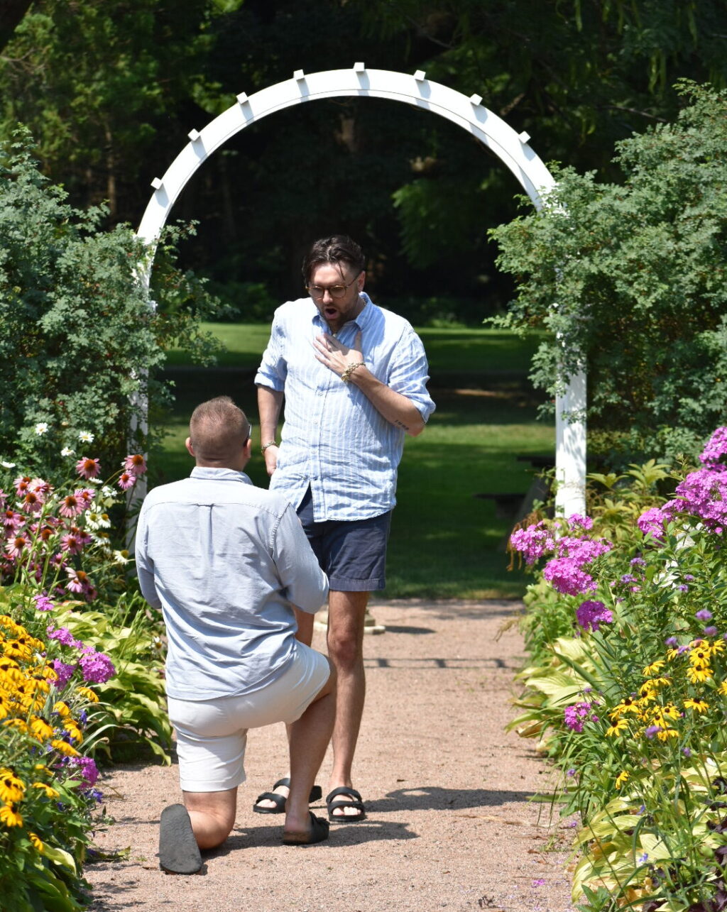 “We live in the historic district in Old Wethersfield, which is one of the oldest towns in the state. It is kind of like Salem, Massachusetts. We also had witch trials,” says Hurst. “Anyway, there’s a famous cove and beautiful gardens where we like to go on walks; the area is kind of hidden away. So, one night, I told him we had to go walk our dog—and Griffin just really didn’t want to go out. But I convinced him he had to, and I just proposed to him there. He was very surprised. I think it was perfect.”